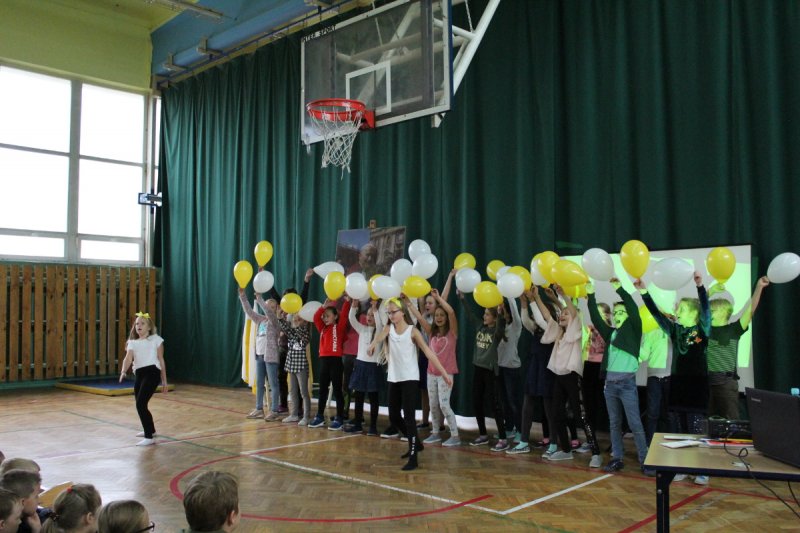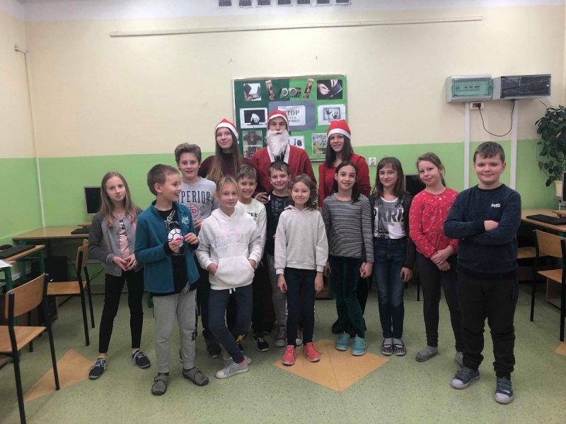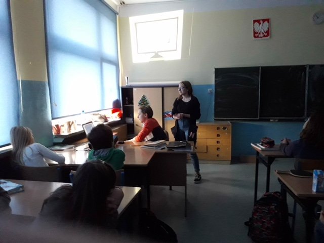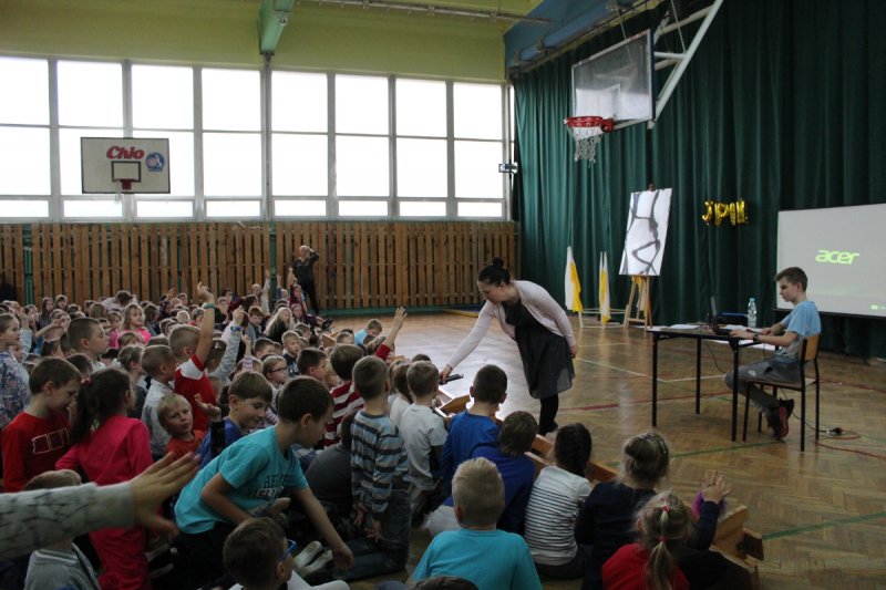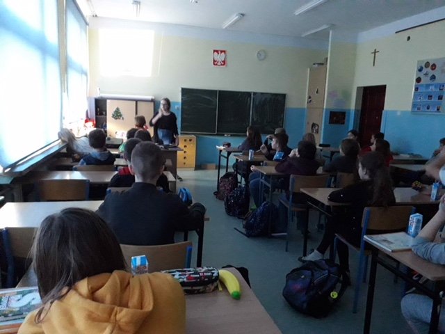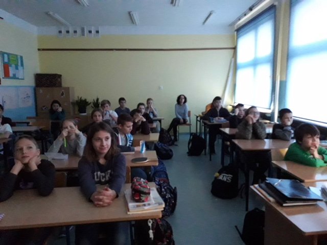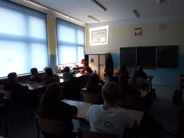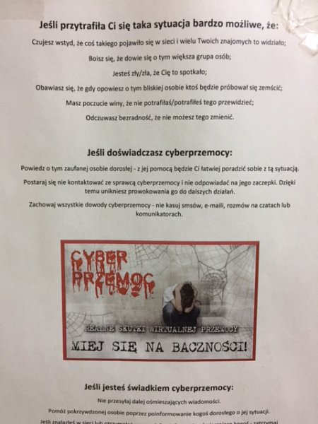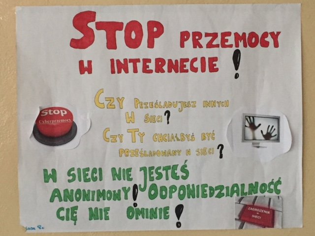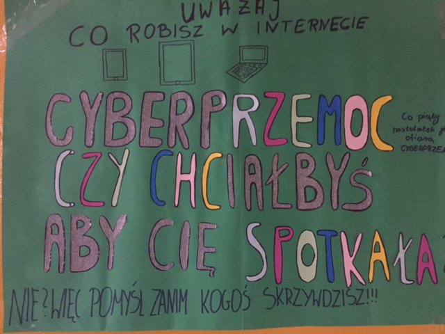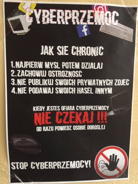 W ramach szkolnego konkursu dla klas pt.”Dziękuję! Nie biorę!” realizowanego w tym roku, klasa VIIIc przygotowała akcję informacyjną nt. cyberprzemocy. Michał przygotował prezentację multimedialną i wraz z Julką pouczyli klasy piąte, jak bezpiecznie poruszać się w sieci oraz przedstawili konsekwencje cyberprzemocy. Lekcja była częścią programu realizowanego w tym roku w szkole „Bezpieczni w sieci”.
