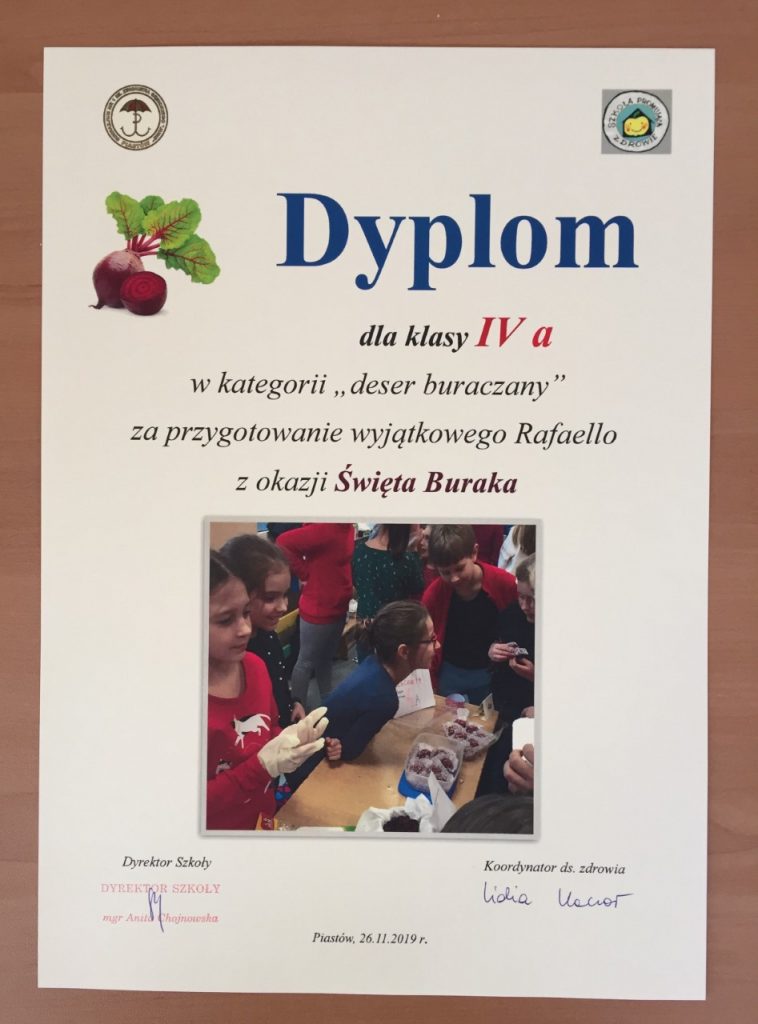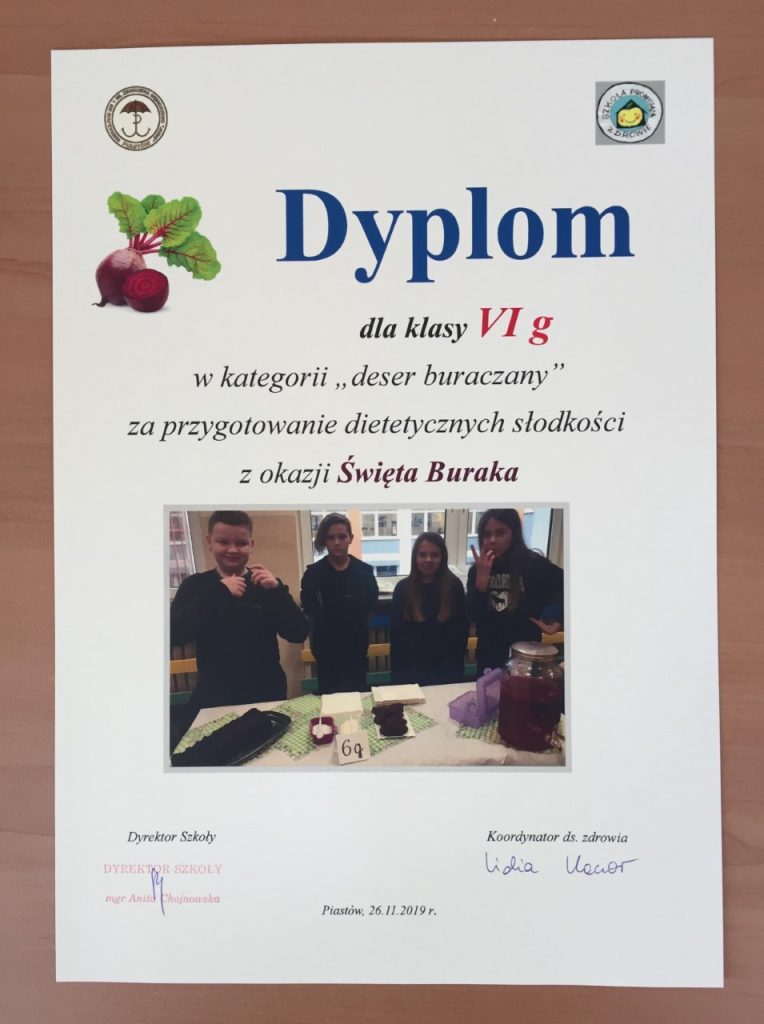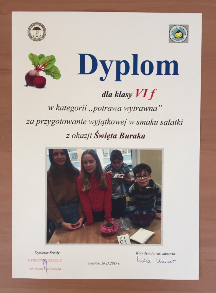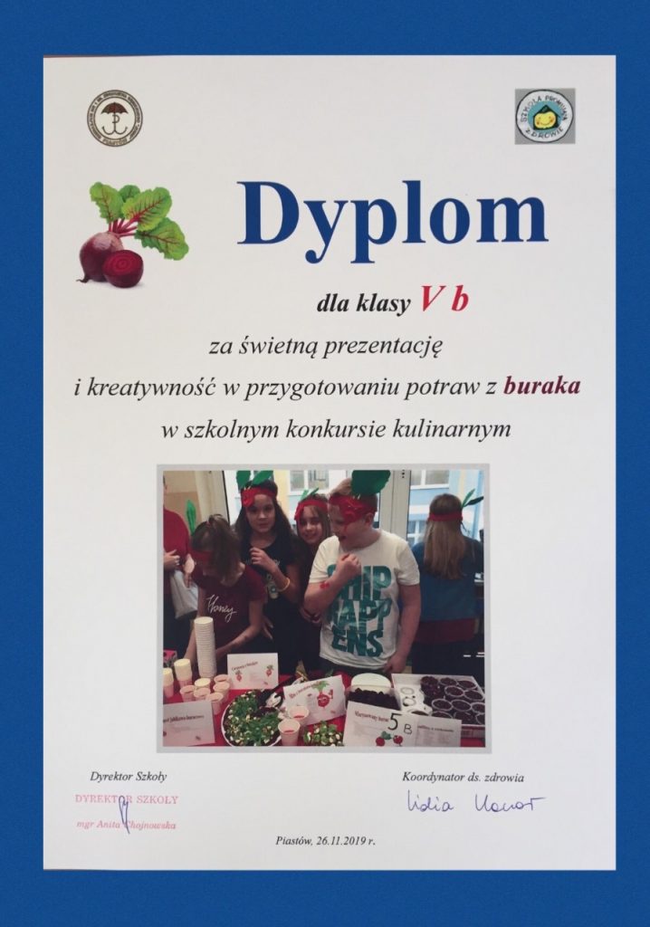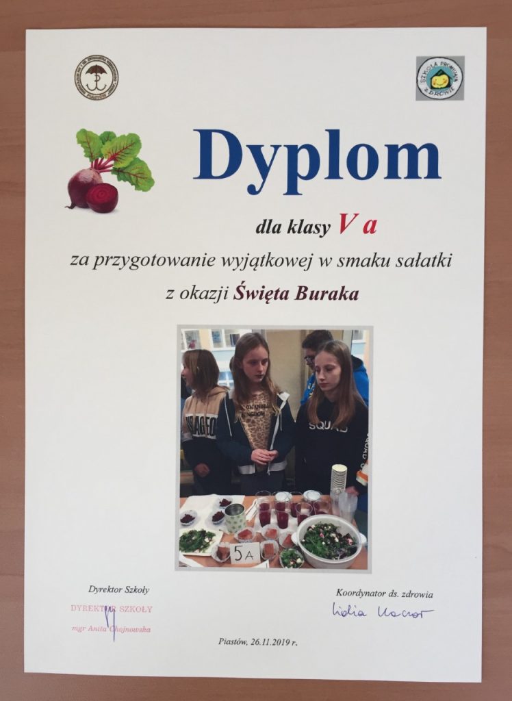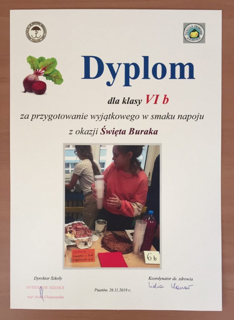 W listopadzie, w dzień promocji zdrowotnych wartości warzyw, zorganizowaliśmy Święto Buraka. Klasa Vb wykazała się ogromnym zaangażowaniem i kreatywnością prezentując nam zalety tego warzywa, a propozycje potraw były godne najlepszych specjalistów kuchni. (Wyniki konkursu poniżej na dyplomach).