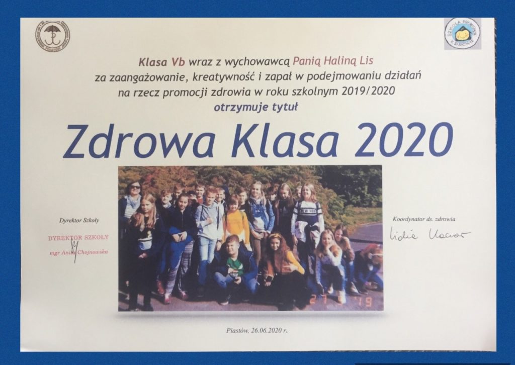 Szkolny Zespół Promocji Zdrowia za całokształt działań na rzecz zdrowia postanowił wyróżnić i przyznać klasie Vb tytuł Zdrowej Klasy 2020 (wychowawca: Halina Lis). Klasa ta wzięła udział we wszystkich szkolnych i pozaszkolnych projektach, w większości których była najlepsza, wykazała się przy tym ogromną pomysłowością i zaangażowaniem.