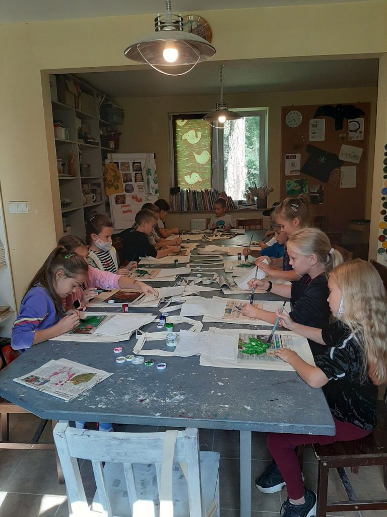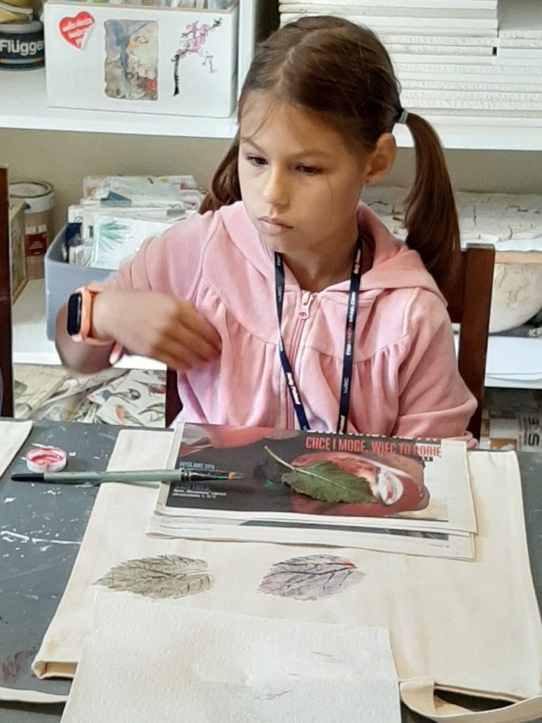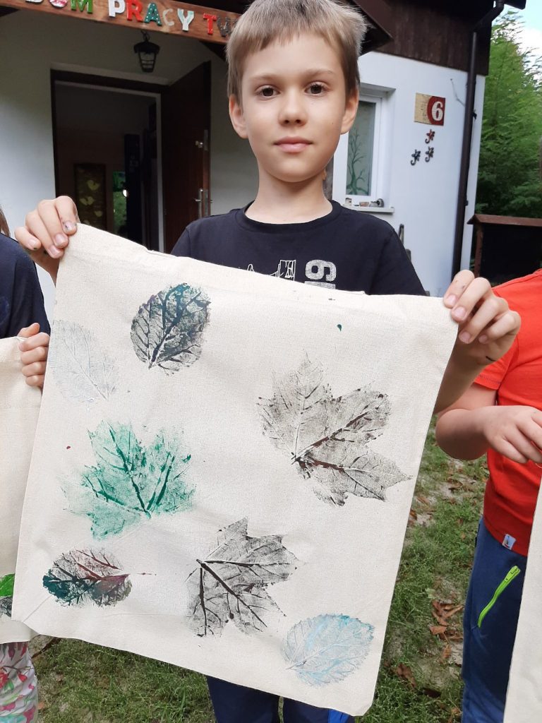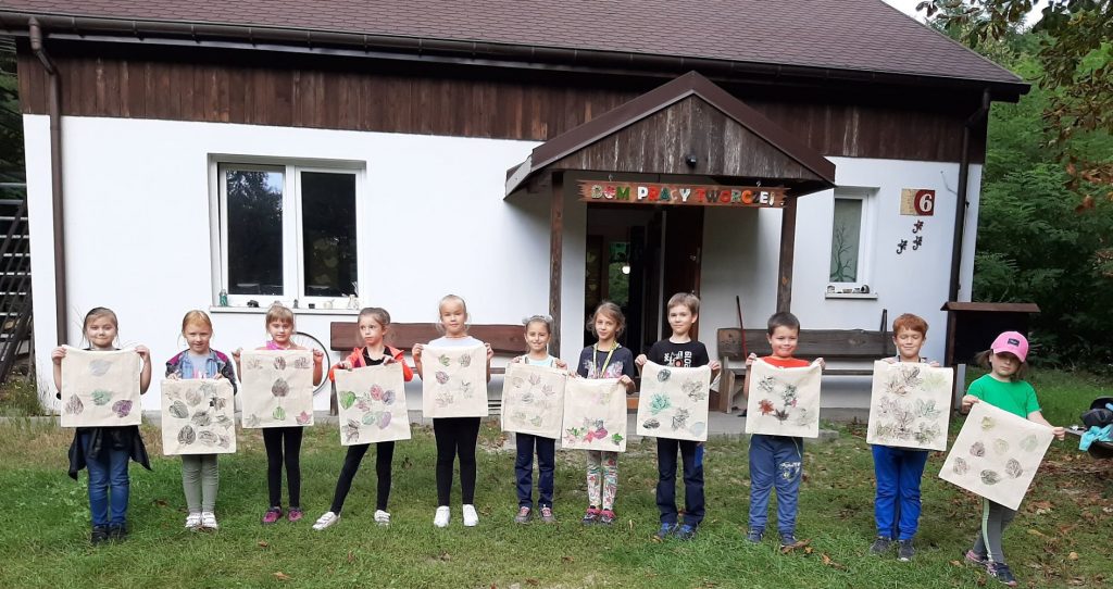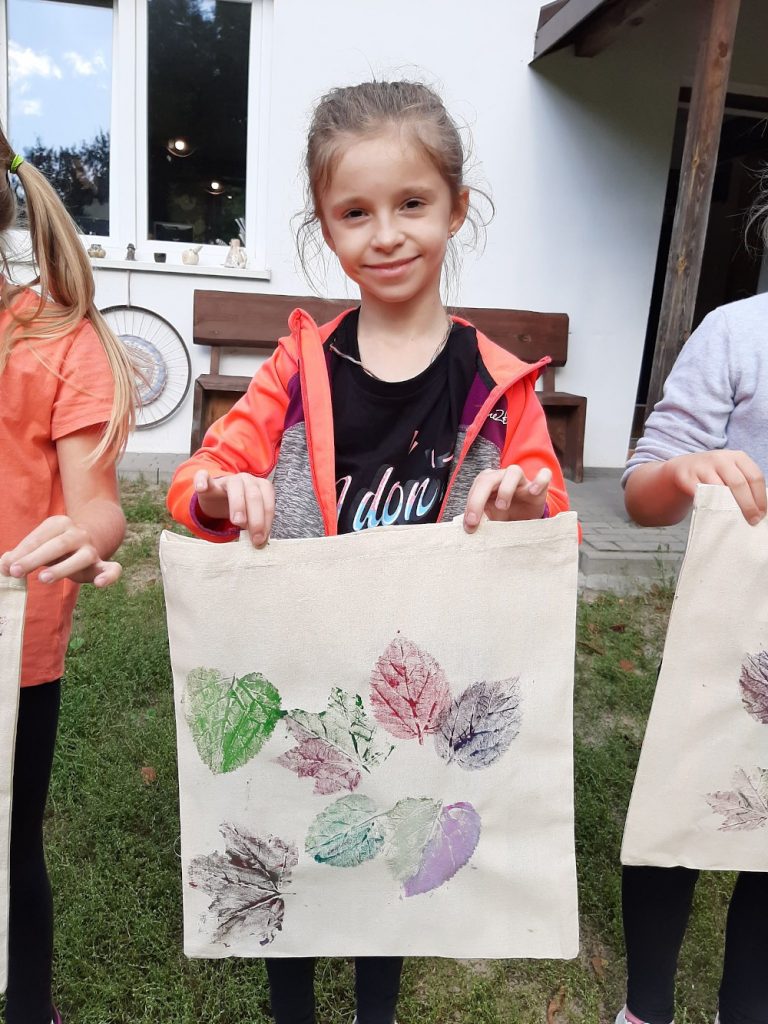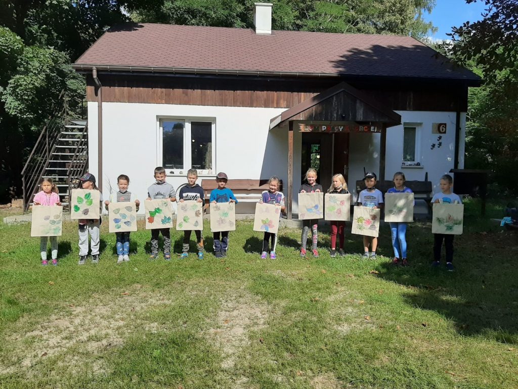 10 września, w czwartek klasa 2 c wybrała się na wycieczkę do Domu Pracy Twórczej w Kampinoskim Parku Narodowym, na warsztaty z frotażu.( Frottage – technika odciskania dowolnych przedmiotów o fakturalnie ukształtowanych powierzchniach w celu uzyskania dokładnego odwzorowania ich struktury np liści, na powierzchni papieru lub płótna. ) Pierwsza grupa udała się na warsztaty, dzieci malowały spód liścia farbami do płótna, za pomocą pędzelka, a następnie na bawełnianej torbie odbijały jego strukturę. Podczas tego warsztatu uczniowie poznali różne rodzaje liści, dopasowując je do gatunków drzew, krzewów i kwiatów. Druga grupa, wraz z przewodnikiem wybrała się na Spacer po KPN, żeby zwiedzić : wydmy, Obszar Ochrony Ścisłej „Granica”, skansen. Zadaniem dzieci było zapamiętać wszystkie szczegóły w danym obiekcie. Na koniec cała klasa, podzielona za 4 zespoły, brała udział w grze plenerowej ” Piękno ukryte w szczególe ” . Każda grupa otrzymała po 6 zdjęć z elementami zwiedzanych wcześniej obiektów , które należało odszukać i wypisać dokładną nazwę na specjalnej mapie. Świetna zabawa i nauka, wrócimy tam z pewnością 🙂