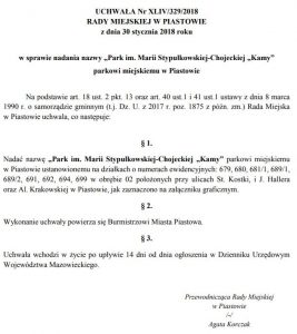 Maria Stypułkowska-Chojecka „Kama” – została patronem rewitalizowanego piastowskiego parku, dzięki działaniom posłów na XXIII Sejm Dzieci i Młodzieży – Michaliny Pawlak i Mateusza Wolskiego, uczniów klasy 3a Gimnazjum nr 1 im. Zbigniewa Gęsickiego „Juno” w Piastowie.