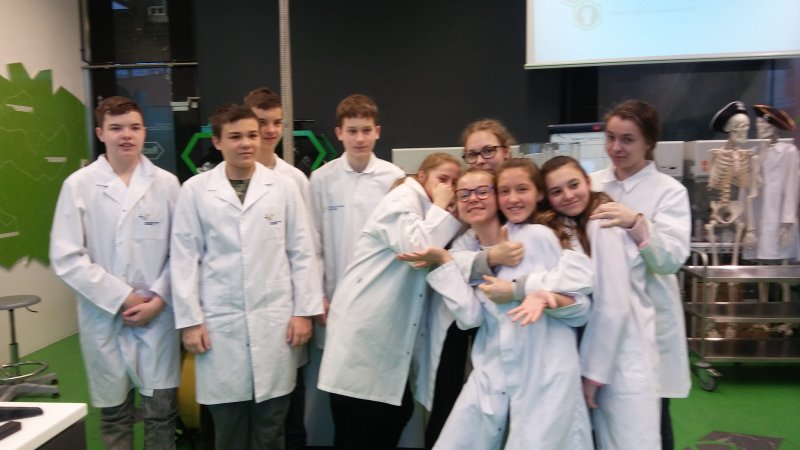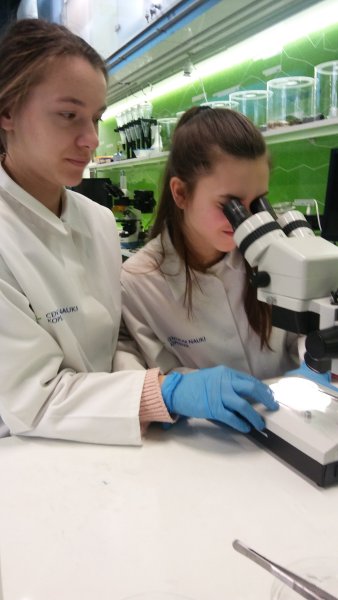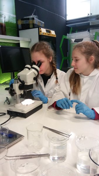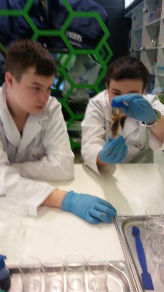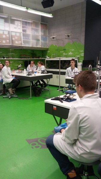 Zwiedzanie rozpoczęliśmy od podziału na dwie grupy, część z nas przeszła do laboratorium biologicznego. I tu zaczęła się przygoda z prawdziwą lekcją biologii w praktyce. Białe fartuchy, rękawiczki, stoły laboratoryjne, odczynniki, sprzęt laboratoryjny sprawiły, że poczuliśmy się niezwykle ważni. Dowiedzieliśmy się jak optycznie wybarwić tkanki roślinne i zwierzęce (sami to wykonaliśmy!). Dobrze poszło nam rozpoznawanie narządów myszy, choć zaskoczyła nas wielkość macicy, która może pomieścić kilka lub kilkanaście płodów!. Obserwacje mikroskopowe uzmysłowiły nam potrzebę ciągłego poznawania biologii. Dwugodzinne zajęcia przebiegły nam bardzo szybko, była to dla nas pasjonująca lekcja biologii w laboratorium.