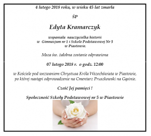 Żegnając Cię Edytko, powtarzamy za Albertem Einstainem, że: „Śmierć nie jest kresem naszego istnienia – żyjemy w naszych dzieciach i następnych pokoleniach”.