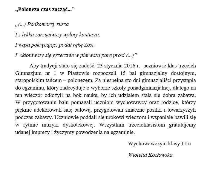 10.01.2016 roku w Piastowie zagrała WOŚP. Poza zbiórką publiczną odbyły się imprezy towarzyszące. W MOK-u występowała młodzież z piastowskich szkół. Nie mogło zabraknąć przedstawicieli naszego gimnazjum. Grupa 21 osób reprezentowała szkolny chór, którym opiekuje się p. E. Sadowska i p. Jan Dąbrowski. Uczniowie wykonali 6 piosenek. Dzięki szkole mieli okazję do włączenia się w ogólnopolską akcję i robienia tego, w czym dobrze się czują.