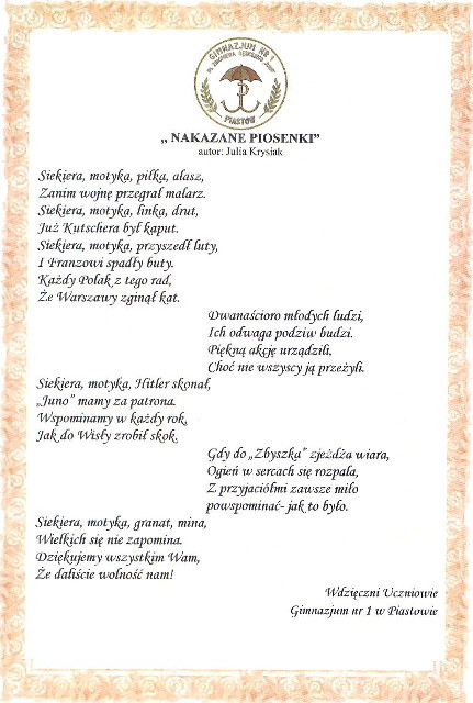 Na pamiątkę spotkania jego uczestnikom wręczono pocztówki ze słowami specjalnie napisanej na tę uroczystość „Nakazanej piosenki” (autor Julia Krysiak) traktującej o wydarzeniach sprzed 71 lat, która stała się jednocześnie podziękowaniem za dar Wolności.