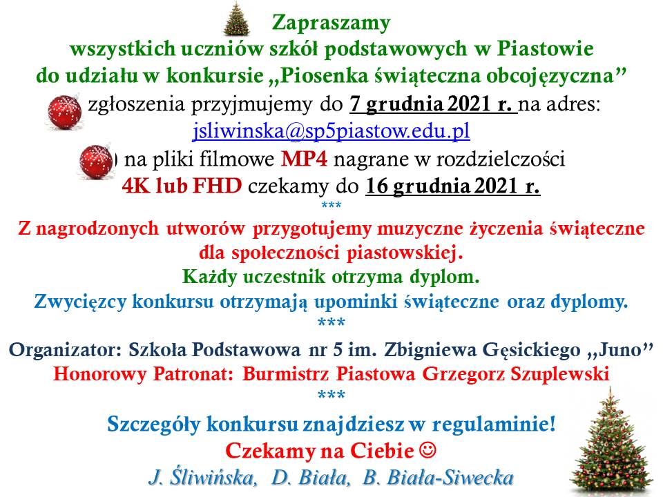 Zapraszamy wszystkich uczniów Szkoły Podstawowej nr 5 do udziału w konkursie „Najpiękniejsza ozdoba świąteczna”.