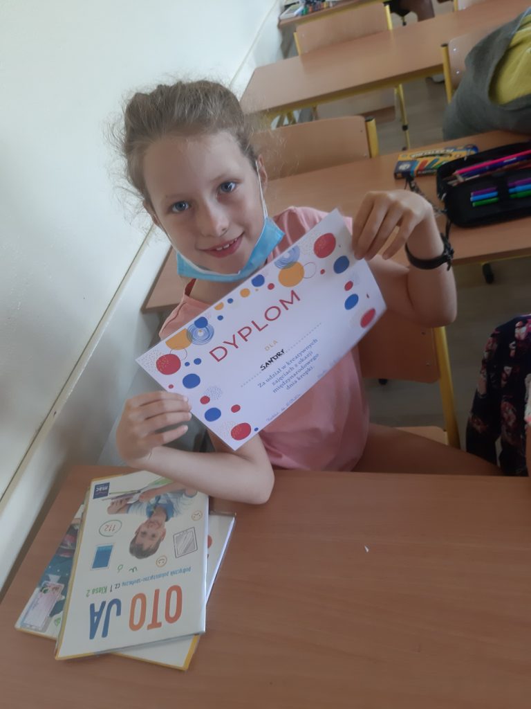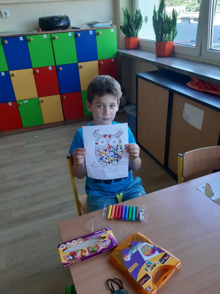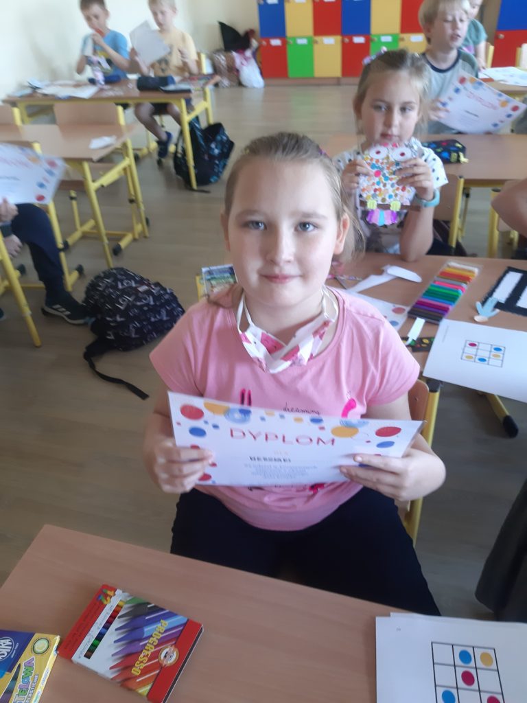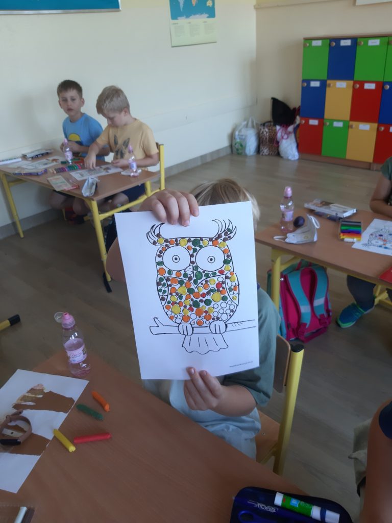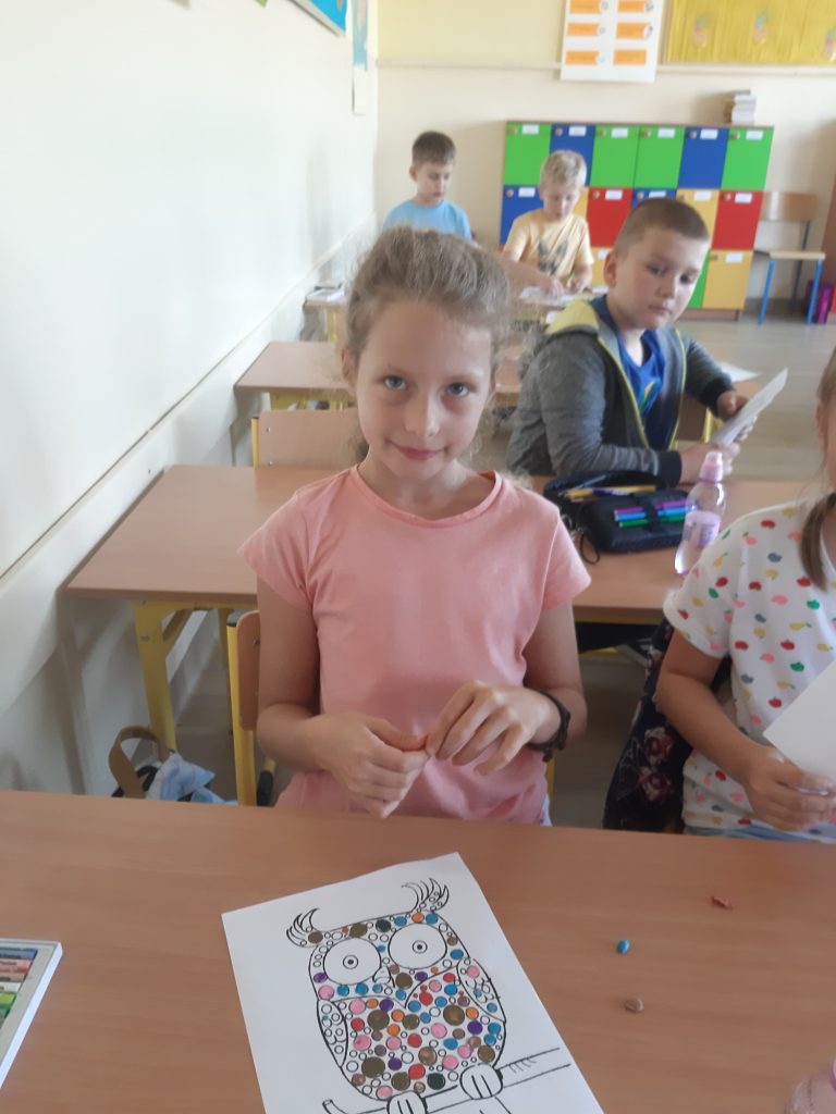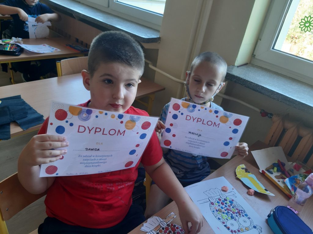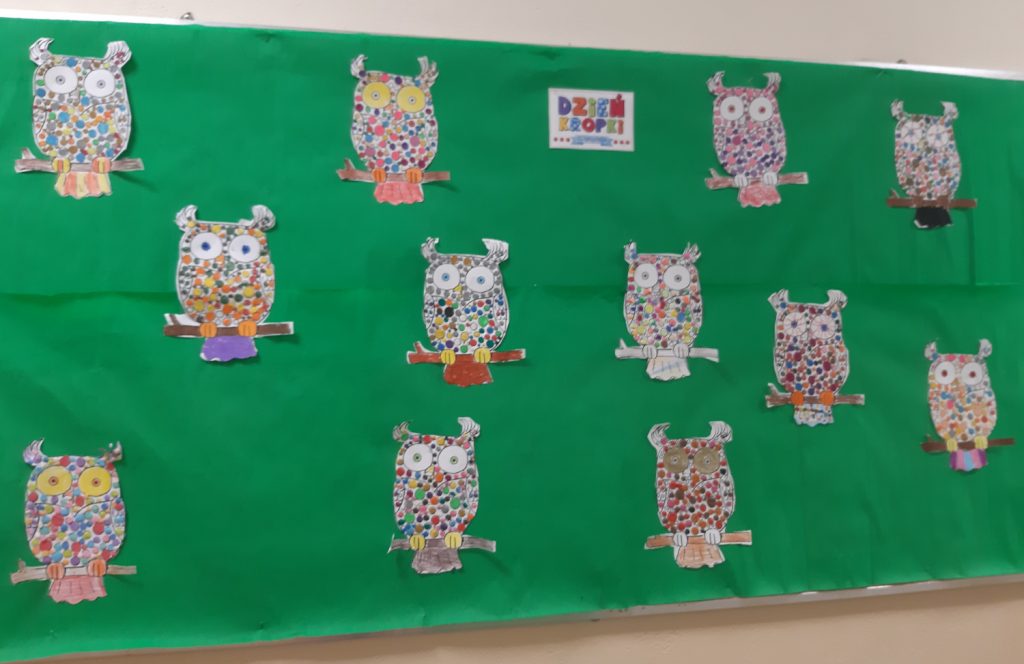 W dniu 15 września odbył się „Międzynarodowy dzień kropki”. Dzieci oglądały film o małej Vashti, która została artystką. Film nauczył nas, że możemy osiągnąć sukces, jeśli bardzo tego chcemy. Zrobiliśmy piękne, kropkowe sówki, które zaprezentowaliśmy na tablicy. Dzieci w klasie rozwiązywały kropkowe sudoku. Na koniec dzieci otrzymały dyplomy i KROPKA.