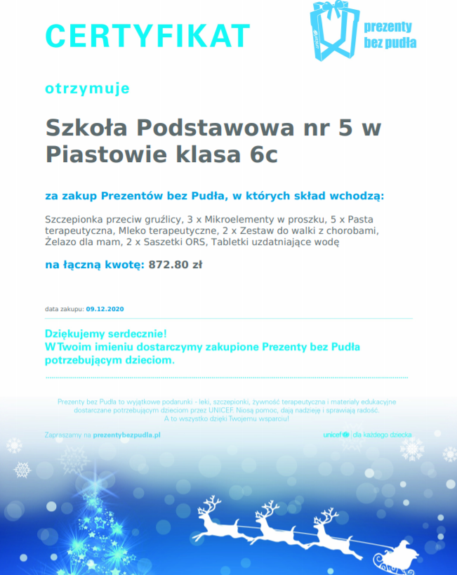 Uczniowie klasy 6C w ramach Akcji humanitarnej UNESCO ,,Prezenty bez pudła” przeznaczyli kwotę 872, 80 zł na zakup produktów humanitarnych ratujących życie dla dzieci z Jemenu.