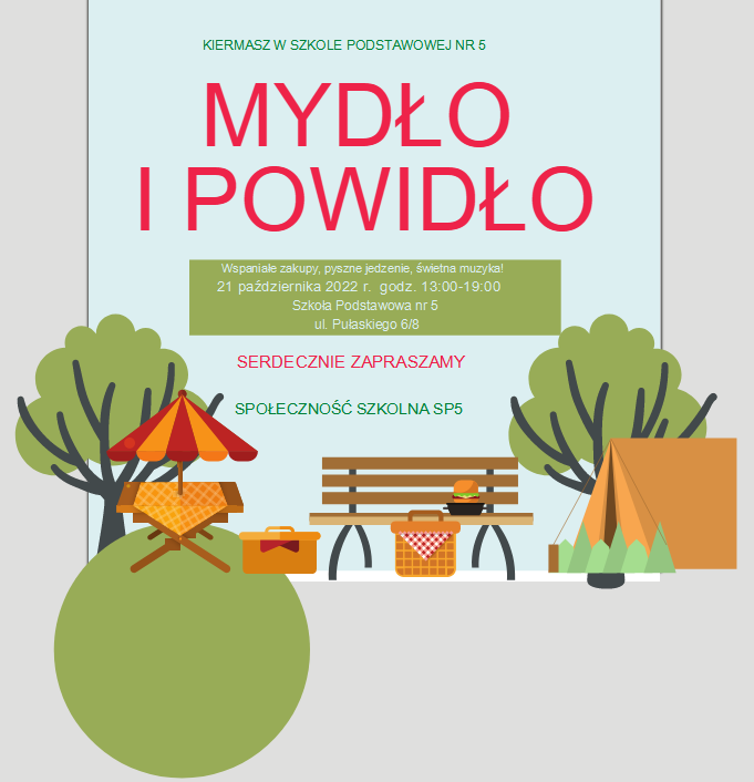 informujemy, że 21 października 2022 w godzinach 13.00 – 19.00 w Szkole Podstawowej nr 5 przy ulicy Pułaskiego 6/8 na parterze odbędzie się kiermasz „Mydło i powidło”.