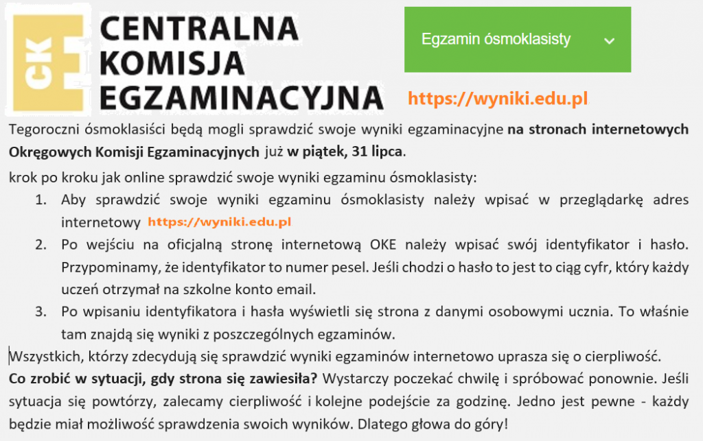 W związku z zaleceniem przekazanym przez dyrektora CKE zaświadczenia o wynikach egzaminu będą wydawane w szkole w dniu 31 lipca w godzinach 14-16. Osoby, które nie będą mogły odebrać zaświadczenia w piątek, zapraszamy do sekretariatu w poniedziałek w godzinach 10-13