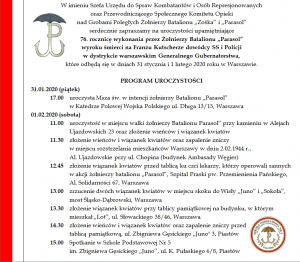 O godzinie 17:00 reprezentacja uczniów, nauczycieli i poczet sztandarowy szkoły weźmie udział we mszy św. w Katedrze Polowej Wojska Polskiego w Warszawie odprawianej w intencji żołnierzy Batalionu „Parasol” i uczestników Akcji Bojowej Kutschera.